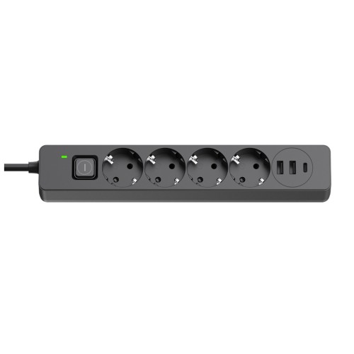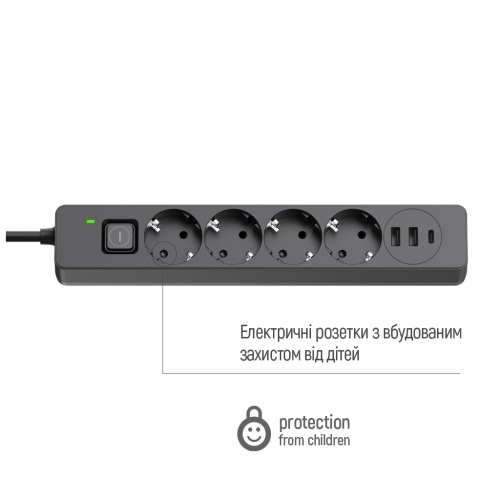 Мережевий фільтр ColorWay CW-CHE435PDB містить чотири мережеві розетки 220В і три USB-порти. Захисні шторки на розетках забезпечують безпеку використання, а автоматичний розподіл енергії між USB-портами забезпечує ефективну зарядку пристроїв (до 24Вт). Два USB-порти підтримують швидку зарядку Quick Charge 3.0, а третій порт USB-C PD підтримує швидку зарядку для Apple пристроїв. Зручна кнопка ввімкнення/вимкнення і світлодіодна індикація спрощують його використання. Подовжувач також обладнаний заземленням і захистом від перенапруги, що забезпечує безпечну роботу.