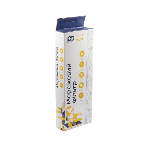 Мережевий фільтр (JY-1056/3) на 5 розеток призначений для під'єднання широкого спектра комп'ютерної, побутової та електронної техніки до електричної мережі змінного струму з номінальною напругою не більш ніж 240 В і номінальним струмом не більш ніж 10 А. Кабель завдовжки в 3 м дасть змогу під'єднати техніку в місцях, віддалених від стаціонарних розеток. Корпус мережевого фільтра виготовлений із вогнетривкого пластику. Фільтр обладнаний універсальними розетками євростандарту із заземленням. Надійний і зручний подовжувач захистить електронну техніку від короткого замикання й перепадів напруги. Мережевий фільтр PowerPlant стане чудовим помічником у будинку, офісі або на дачі.