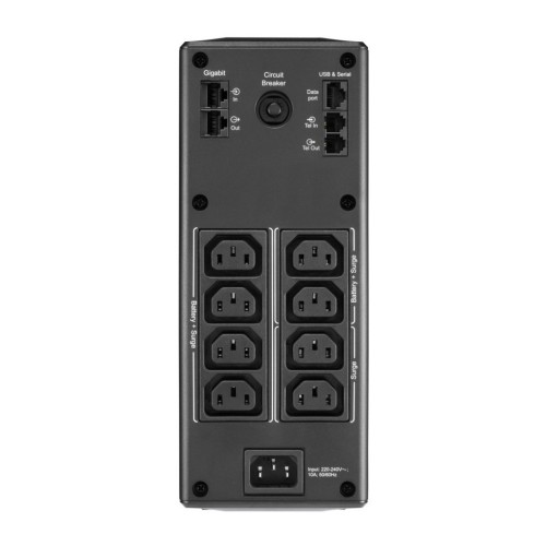 Пристрій оснащено восьми IEC розетками, розташованими таким чином, щоб забезпечити максимальну зручність при підключенні великогабаритних мережних адаптерів, не перекриваючи доступ до інших розеток. Додатковий фільтр RJ-45 захищає мережеве обладнання від стрибків напруги, що особливо важливо для офісного та домашнього інтернет-з’єднання.
