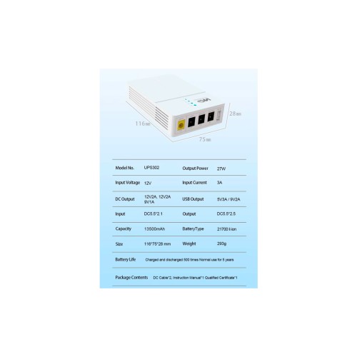 Пристрій безперебійного живлення RCI для роутера WGP 27W - це ідеальне рішення для забезпечення стабільної роботи вашого обладнання. Підтримує вхідну напругу 12В і оснащений вбудованою акумуляторною батареєю. Цей Mini-UPS розроблений для резервного живлення WiFi роутерів, IP-телефонів, камер відеоспостереження та іншого обладнання, яке потребує надійного джерела безперебійного живлення.