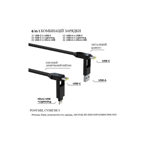 • 6 в 1 — підтримує всі популярні типи з’єднань: USB-A → USB-C; USB-A → Lightning; USB-A → Micro USB; USB-C → USB-C; USB-C → Lightning; USB-C → Micro USB