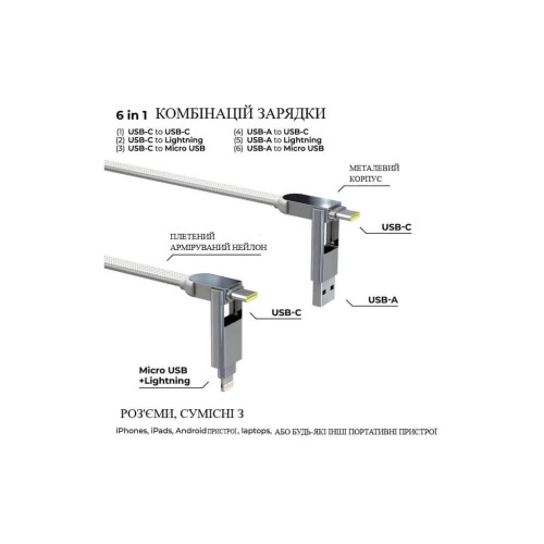 • 6 в 1 — підтримує всі популярні типи з’єднань: USB-A → USB-C; USB-A → Lightning; USB-A → Micro USB; USB-C → USB-C; USB-C → Lightning; USB-C → Micro USB