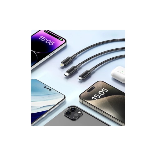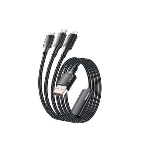 Кабель довжиною 1.2 метра має три роз'єми: USB Type-A для USB Type-C, Lightning та Micro USB, що забезпечує сумісність із широким спектром гаджетів. Завдяки міцній конструкції з алюмінієвого сплаву та міцного оплетення, кабель забезпечує довговічність та надійність. Крім того, кабель підтримує швидкість передачі даних до 480 Мбіт/с.