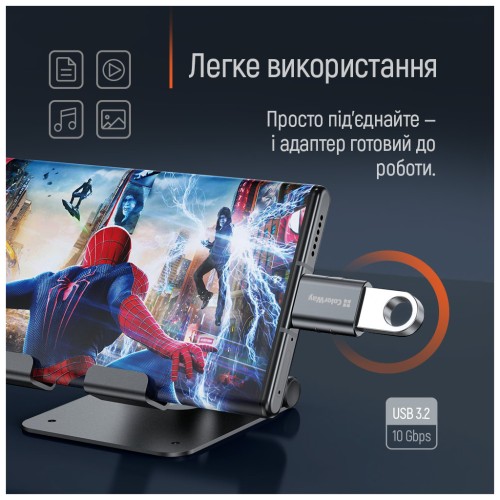 • Простий у використанні: достатньо вставити конектор USB-A у адаптер та підключити його до порту USB-C.