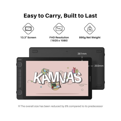 Kamvas 13 (Gen 3) успадкував 13.3-дюймовий екран від свого попередника з роздільною здатністю FHD (1920X1080), що гарантує плавну взаємодію з вашим ноутбуком. Міцне заднє покриття також забезпечує чудовий захист, гарантуючи стабільність інтерфейсу, все підготовлено для вашого творчого робочого процесу.