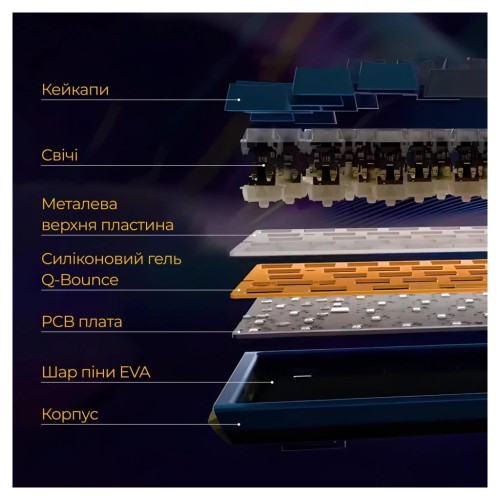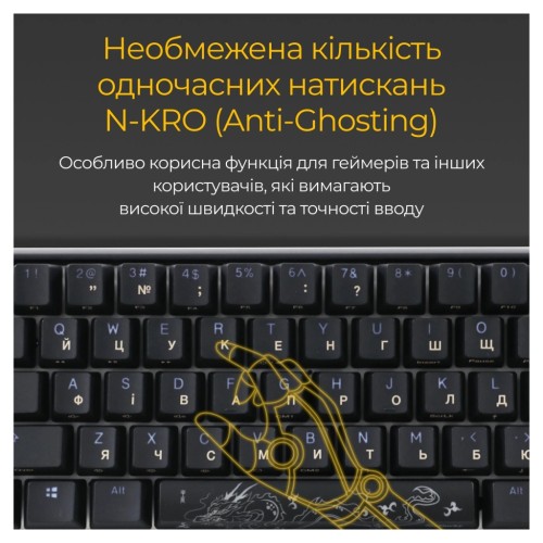 Клавіші виконані з високоякісного PBT пластику з лазерним гравіюванням українсько-англійської розкладки, що забезпечує їх довговічність. Додатково, NKRO технологія гарантує точність введення команд, навіть при одночасному натисканні кількох клавіш, що особливо важливо у динамічних ігрових ситуаціях.