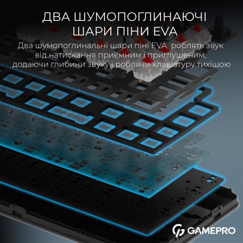 Надійні PBT-кейкапи і тип побудови Gasket Mount із двома шумопоглинаючими шарами EVA забезпечують приємний тактильний відгук і зменшення шуму під час друку.