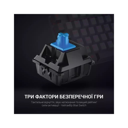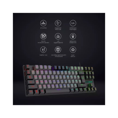 Формат клавіатури TKL (Tenkeyless) без цифрового блоку дозволяє заощадити місце на столі, зберігаючи при цьому всі необхідні функціональні клавіші. Яскраве LED-підсвічування зробить ваш ігровий стіл стильним і сучасним, а також полегшить роботу в умовах низької освітленості. Клавіатура підтримує розкладку трьох мов – російської, англійської та української, що робить її універсальним вибором для користувачів з різних регіонів.