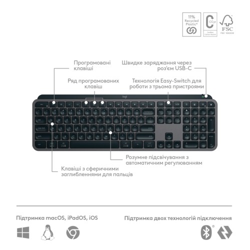 Інтелектуальне підсвічування White LED додає особливого шарму цьому виробу. Клавіатура автоматично активує підсвічування при наближенні пальців і змінює яскравість залежно від освітлення у приміщенні. Це дозволяє зосередитися на роботі незалежно від часу доби. Ви можете персоналізувати яскравість за допомогою програми Logi Options+, що додає індивідуальності та зручно налаштовується під будь-які вимоги.