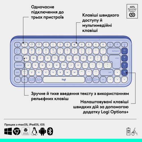 Logitech POP Icon Keys відрізняється універсальною сумісністю з різними платформами, такими як iOS, Mac OS та Windows, що робить її незамінним інструментом для всіх ваших мультимедійних пристроїв. Незалежно від того, чи використовуєте ви планшет, телевізор або смартфон, ця клавіатура забезпечить надійне Bluetooth-з'єднання.