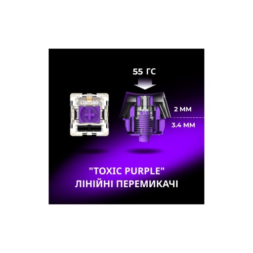 Вона оснащена лінійними перемикачами LORGAR Toxic Purple з ресурсом у 50 мільйонів натискань, що забезпечують плавне та тихе введення. Завдяки гаскетному монтажу клавіші мають м’який хід і знижений рівень шуму.