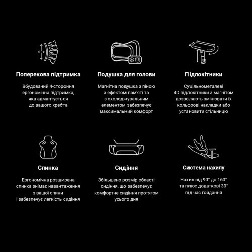 Нова складна внутрішня система підтримки попереку. Усередину та назовні, вгору та вниз, що контролюється 2 бічними ручками, які забезпечують потрібну кількість твердості або тиску на вашу спину в бажаній позі. Вбудована поперекова підтримка виглядає набагато природніше, оскільки вона виглядає як частина крісла, а не окрема подушка з ременем або її важко регулювати.
