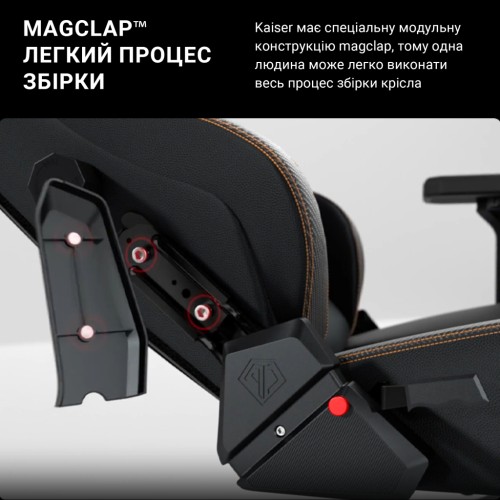 На відміну від інших ігрових крісел, Anda Seat Kaiser 3 має спеціальну модульну конструкцію MagClap, яку можна легко зібрати. Просто вставте спинку в основу сидіння, потім затисніть магнітні бічні кришки з обох сторін. Лише одна людина може з легкістю завершити весь процес складання. Всього за кілька хвилин ваше ідеальне ігрове крісло готове до боротьби з вами!
