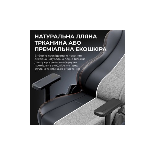 Особливий акцент зроблено на покритті з натурального льону, яке не тільки приємне на дотик, але й забезпечує чудову циркуляцію повітря, що додає відчуття прохолоди в будь-якій ситуації. Завдяки ергономічній формі спинки, крісло забезпечує оптимальну підтримку для хребта, допомагаючи користувачам уникнути втоми та дискомфорту навіть під час довготривалих сесій.