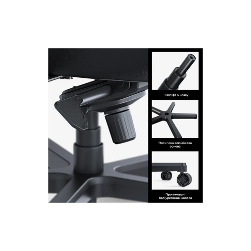 Спинка крісла відхиляється на 135°, а режим гойдання дозволяє нахилитись на додаткові 15°. Газліфт 4-го класу забезпечує плавне регулювання висоти на 6.5 см, що підходить для користувачів зростом від 150 до 210 см.