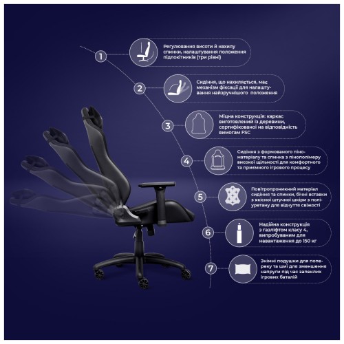 Одне з головних достоїнств цього крісла — регульовані підлокітники, які легко пристосовуються до висоти і кута, забезпечуючи індивідуальний комфорт для кожного геймера. Це, у поєднанні з можливістю налаштування підголівника та системи пом'якшення попереку, створює надійну підтримку під час тривалих ігрових сесій.