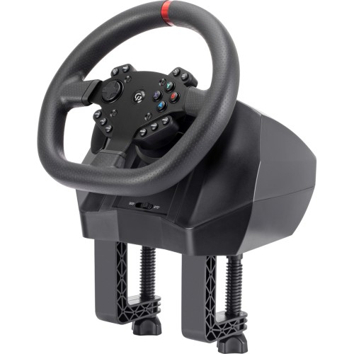 Ергономічні гумові накладки забезпечують міцний хват та комфорт навіть під час тривалих ігрових сесій. До комплекту постачання входить блок педалей "газ", "гальмо", "зчеплення" а також окремий ричаг механічної коробки передач. Шість надійних вакуумних фіксаторів надійно утримують кермо на поверхні столу, запобігаючи ковзанню.