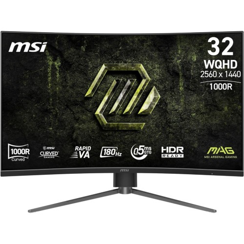 Монітор MSI MAG 325CQPF-E18 — 31.5-дюймовий вигнутий екран VA з роздільною здатністю 2560x1440, частотою 180 Гц, часом відгуку 0.5 мс, охопленням sRGB 111%, Adaptive Sync та регулюванням висоти (HAS). Швидка панель VA з AI Vision для покращення яскравості та деталізації, менше синього світла для комфорту очей. Підключення: 2x HDMI, DP, аудіо, ідеально для ігор та мультимедіа.