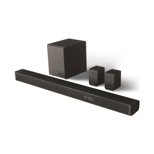 Саундбар має 5.1-канальну конфігурацію із загальною потужністю 340 Вт (220 Вт — саундбар, 120 Вт — сабвуфер). Сім динаміків (лівий, правий, центральний канали в саундбарі, два задні сателіти та 6.5-дюймовий бездротовий сабвуфер) створюють об’ємний звук, хоча справжні верхні драйвери для Dolby Atmos відсутні, а ефект досягається через обробку сигналу. Підтримувані формати: FLAC, MultichPCM, PCM, Декодер DTS, DTS-HD Master, DTS-X, Dolby Digital Plus, Dolby Digital, Dolby THD, Dolby Atmos. Частотний діапазон — 40 Гц–20 кГц.