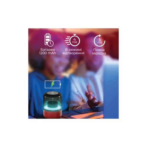 • Li-ion батарея 1200 мАч: Слухай улюблені треки до 4 годин у режимі non-stop. Повністю зарядити колонку можна за 3 години через USB-С кабель, який йде в комплекті.