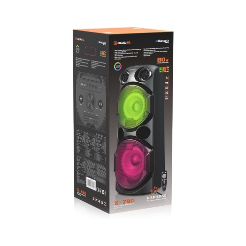 REAL-EL X-780 — потужний стиль, гучний характер! REAL-EL X-780 — це потужна 80Вт-на портативна акустична система. Вона оснащена двома динаміками 2 х Ø 5.7″ (145 мм) + 2 х Ø 1.25″ (32 мм), які забезпечують глибокий бас, яскраву середину та чіткі високі частоти для неймовірного захоплюючого звучання.