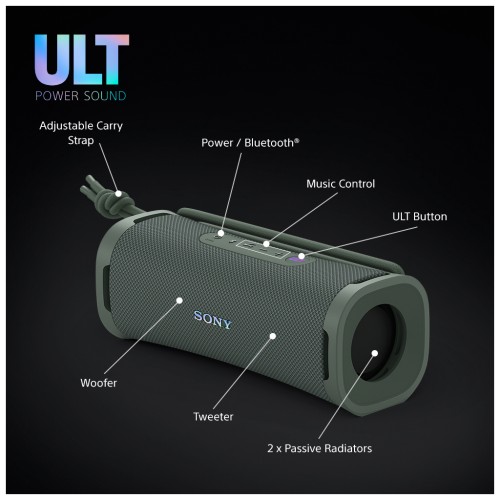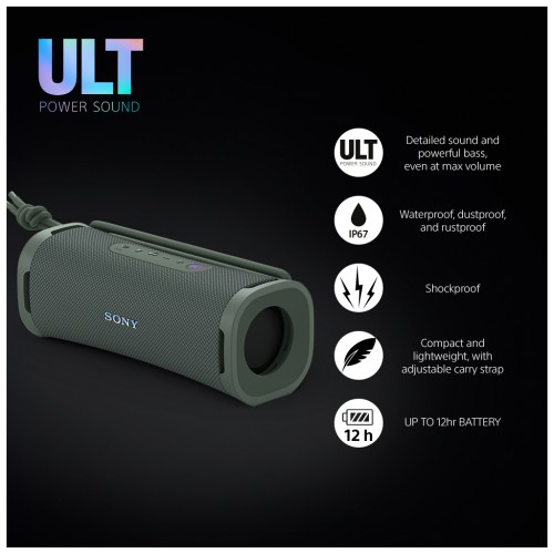 Портативна акустична система Sony ULT FIELD 1 забезпечує потужне звучання з насиченими басами у компактному корпусі. Завдяки кнопці ULT активується режим глибоких низьких частот, а процесор Sound Diffusion Processor розширює звуковий простір. Колонка має захист від води, пилу та ударів за стандартом IP67, що робить її стійкою до зовнішніх умов. До 12 годин автономної роботи гарантують тривале звучання без підзарядки.