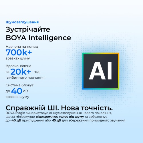 Технологія True AI Noise Cancellation від Boya — це квантовий стрибок у боротьбі з фоновими шумами. Система, натренована на понад 700000 зразків шумів та 20000 годин глибокого навчання, інтелектуально відокремлює ваш голос від навколишнього шуму за мілісекунди.