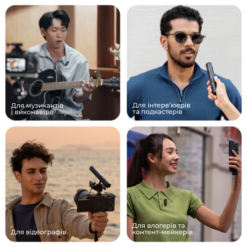 Сумісність: Працює з усіма пристроями — смартфонами (USB-C / Lightning), комп'ютерами, камерами та навіть динаміками. Підтримує одночасне підключення до 2 передавачів на 1 приймач.