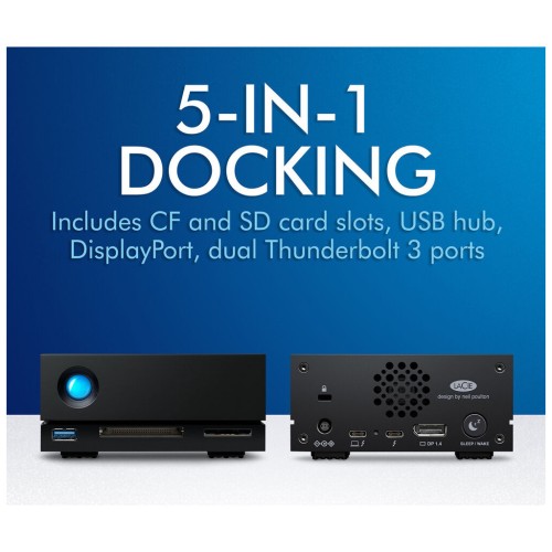 Док-станція 1big ємністю 4 ТБ від LaCie була розроблена як епіцентр робочих процесів у форматі 4K. Він поєднує в собі 3,5-дюймовий жорсткий диск Seagate IronWolf Pro 7200 об/хв SATA, що забезпечує швидкість передачі даних до 280 МБ/с, два порти Thunderbolt 3, порт USB 3.0 Type-A, вихід DisplayPort 1.4 для 8K/60 Гц , Відео 4K / 120 Гц, 1080p та 720p, а також слоти для карт пам'яті SD та CompactFlash. Завдяки алюмінієвому корпусу та терморегульованому вентилятору робочі температури залишаються низькими. У той час як один з портів Thunderbolt 3 використовується для підключення 1big Dock до вашої сумісної системи, що працює як мінімум на Windows 10 або MacOS 10.12, інший можна використовувати для послідовного підключення до шести додаткових пристроїв або забезпечення до 70 Вт потужності заряджання. У комплект LaCie 1big Dock ємністю 16 ТБ входять кабель Thunderbolt 3 40 Гбіт/с, кабель USB 3.0 та зовнішній блок живлення.