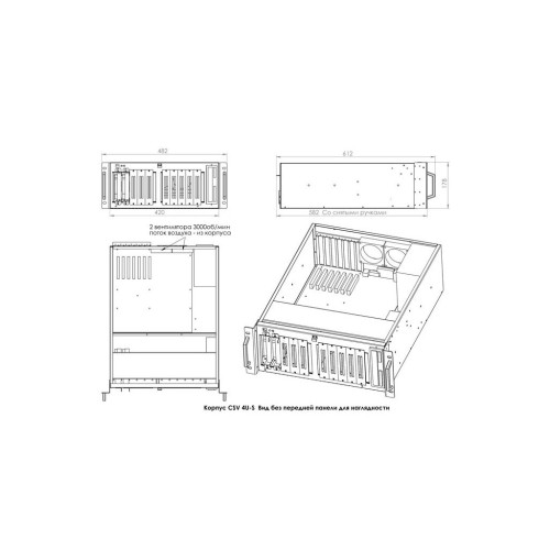 Корпус CSV 4U-S для збірки серверів початкового і середнього рівня з одним або двома процесорами. Можлива збірка двопроцесорних систем. У корпус встановлюється до 10 жорстких дисків злегка доступом. Головною особливістю є можливість складання двопроцесорних систем в форматі 4U з установкою до 10 жорстких дисків. Для правильного монтажу потрібні телескопічні направляючі або комплект жорсткого кріплення. Установка корпусу на монтажні напрямні тільки за передні кронштейни категорично недопустима. Для монтажу потрібно 8 комплектів кріплення гвинт + гайка + шайба (в комплект не входить і замовляється окремо).