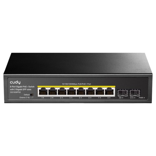 Комутатор оснащений 10 портами Gigabit Ethernet портами – вісім з яких PoE+, два – SFP для підключення до оптоволоконної мережі на великих відстанях.