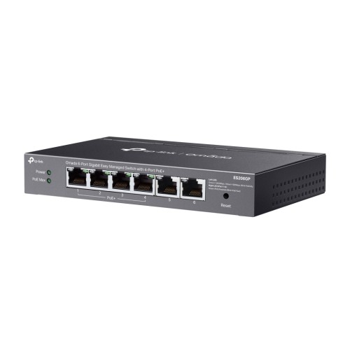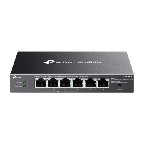 TP-LINK ES206GP – це 6-портовий гігабітний WebSmart-комутатор із 4 портами PoE+ (802.3af/at) та бюджетом потужності 65 Вт. Підтримує QoS, VLAN, IGMP Snooping, автоматичне відновлення PoE та централізоване керування через хмару Omada.