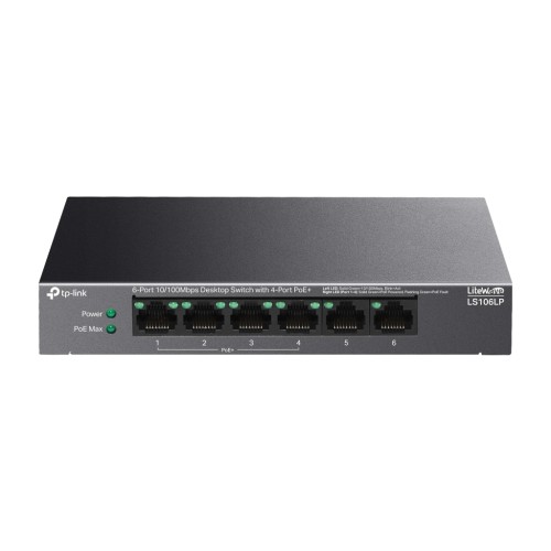 TP-LINK LS106LP – 6-портовий некерований комутатор Fast Ethernet із 4 портами PoE+ (802.3af/at). Забезпечує загальний бюджет живлення 41 Вт і до 30 Вт на порт. Підтримує режим розширення з передачею даних і живленням на відстань до 250 м.