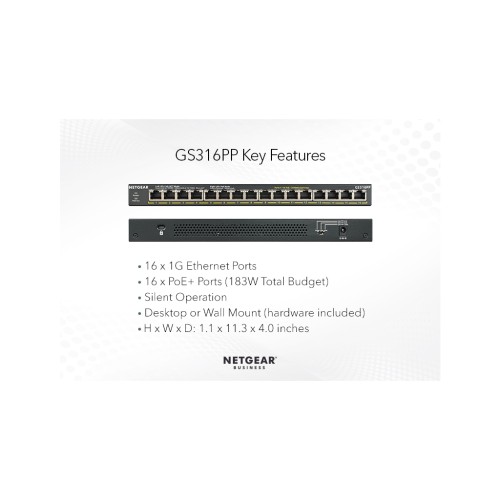 Некерований гігабітний комутатор NETGEARGS316PP з 16 портами PoE + Gigabit Ethernet із загальним бюджетом потужності 183 Вт і фірмовою технологією автоматичного балансу потужності NETGEAR FlexPoE.