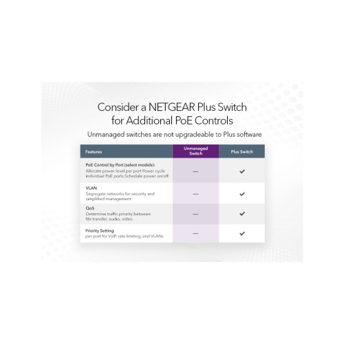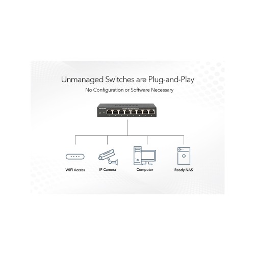 Некеровані комутатори NETGEAR серії GS3xxPP Gigabit Ethernet з підтримкою технології PoE/PoE + допоможуть створити просту, надійну та доступну мережу для дому та невеликого офісу з можливістю під'єднання PoE-пристроїв. За допомогою цих легко під'єднуваних та автоматично настроюваних некерованих Plug-and-Play комутаторів ви можете легко розширити свою мережу, миттєво під'єднавши до кількох пристроїв.