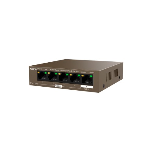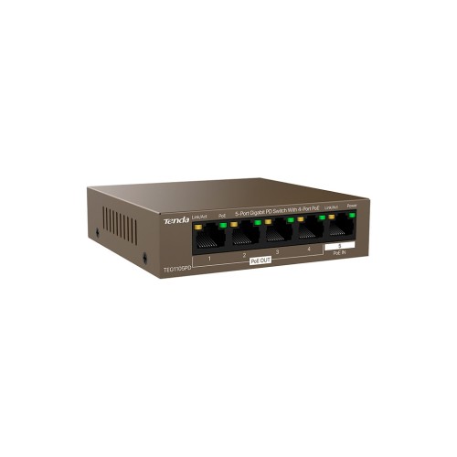 Комутатор мережевий Tenda TEG1105PD - це високопродуктивний пристрій, який поєднує в собі простоту використання та надійність, надаючи вашим мережам гігабітне з'єднання на найвищому рівні. Зроблений для тих, хто цінує ефективність, цей комутатор оснащений п'ятьма гiгабiтними портами, серед яких чотири підтримують PoE OUT (порти 1-4) та один PoE IN (порт 5). Це дозволяє вам не лише подавати живлення на різні пристрої, такі як IP-камери чи точки доступу, а й живити сам комутатор безпосередньо через Ethernet-кабель, що відповідає стандартам IEEE 802.3af/at.