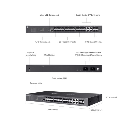 TP-LINK SG3428XF – це професійний L2 комутатор із 20 SFP-слотами, чотирма комбінованими SFP/RJ45 портами та чотирма високошвидкісними 10G SFP+. Він створений для мережевої інфраструктури, де важливі масштабованість і стабільність. Підтримка Omada SDN дозволяє керувати мережею централізовано, а також використовувати локальні інструменти для конфігурації. У пристрої реалізовано широкий набір функцій для маршрутизації, безпеки та керування трафіком. Завдяки резервному живленню SG3428XF працює надійно навіть у критичних системах.