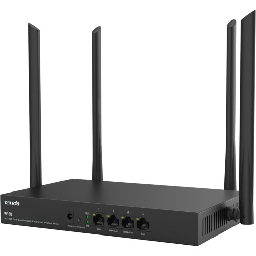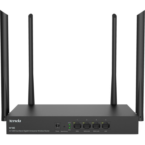 Маршрутизатор TENDA W18E Hotspot AC1200 підтримує швидкість Wi-Fi до 1200 Мбіт/с (2.4 ГГц + 5 ГГц), має 4 гігабітні порти та функцію Captive Portal на 50 акаунтів. Забезпечує стабільну роботу до 80 користувачів з підтримкою VPN, фільтрації та керування пропускною здатністю.