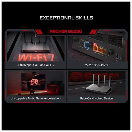 TP-LINK Archer GE230 — дводіапазонний ігровий маршрутизатор з підтримкою Wi-Fi 7 і сумарною швидкістю до 3600 Мбіт/с. Він орієнтований на стабільну мережу для онлайн-ігор, стримінгу та багатозадачного використання. Два порти 2,5 Гбіт/с розширюють можливості дротового підключення. Чотири зовнішні антени та формування променя покращують покриття в будинку. Підтримка EasyMesh дозволяє масштабувати мережу без складних налаштувань.