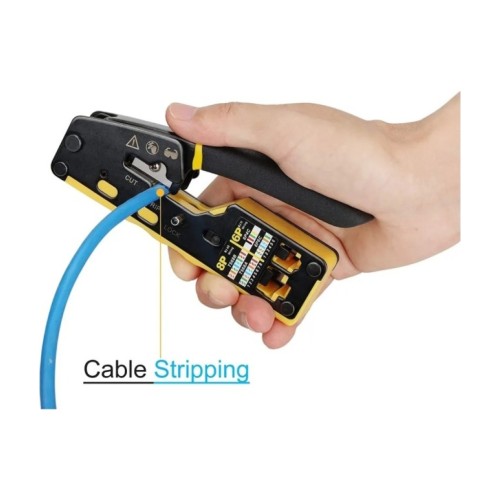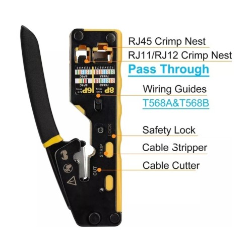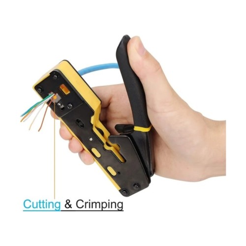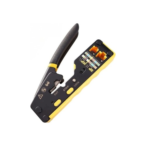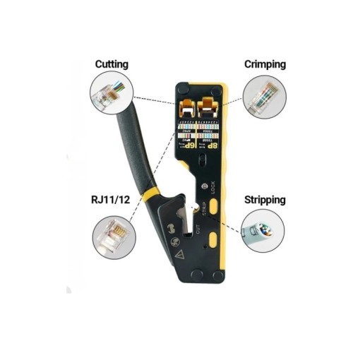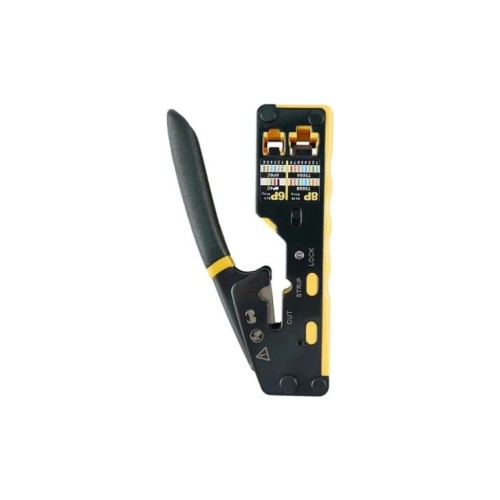 Ручний інструмент для обтискання UTP/STP прохідних конекторів 8P8C/RJ45, а також для телефонних 6P6C/RJ12 та 6P4C/RJ11. Інструмент може бути використаний і для обтиску стандартних ненаскрізних роз'ємів RJ45. У корпус інструменту вбудований різак для обрізання кабелю, і "стрипер" для зачистки, зняття ізоляції. У конструкції передбачено наявність блокування, для зручного зберігання та транспортування. Корпус виконаний із сталі та пластику, у двоколірному виконанні, більш помітний жовтий та чорний.