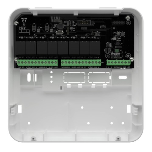 Додає 8 релейних виходів в систему з можливістю їх винесення від ППК на відстань до 1000 м. Це буде корисним для підключення автоматики в віддалених частинах об'єкту - інший поверх, інша будівля тощо. Таким чином можна зменшити кількість дротів та оптимізувати топологію системи.
