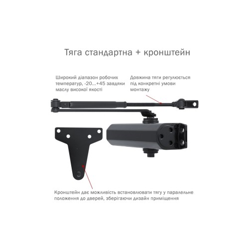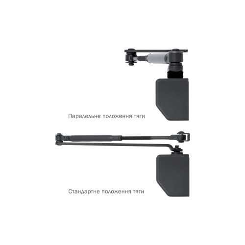 Дотягувач дверей RYOBI® серії 2000 модель D-2055 UNIV (Японія) накладного типу – призначений для керування зовнішніми та внутрішніми дверима. Повністю контролює весь цикл зачинення дверей з роздільно регульованими швидкостями початкового та кінцевого зачинення (прихлопу). Можливе встановлення зі сторони зачинення дверей на дверну стулку з використанням кронштейна паралельної тяги (4 клас). Має регульовану функцію BackCheck (вітрове гальмо), яка затримує відчинення дверей після кута 70-80°, що дозволяє уникнути пошкодження дверей, фурнітури, стін. Клас 3/4/5, згідно EN1154, при встановленні зі стандартною тягою, в залежності від місця монтажу. При встановленні з паралельною тягою відповідає 4 класу. Можливість застосовувати у протипожежних дверях з межею вогнестійкості 60 хв. Максимальна вага дверей до 100 кг, Максимальна ширина дверей 1250 мм.