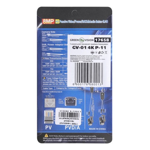 Одноканальний приймач/передавач відеосигналу по кабелю вита пара GV-01 4K P-06, призначений для передачі сигналу з відеокамер: