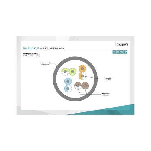 Відмінна продуктивність та якість зв'язку для Вашої мережі. Сполучні кабелі DIGITUS® категорії 6 класу E виготовляються та випробовуються у відповідність до вимог ISO/IEC 11801 та стандарту DIN EN 50173 CAT 6. Гарантія відповідності кабельного з'єднання вимогам специфікації ISO&EN, а також наявність чудових функціональних характеристик кабельного з'єднання DIG.