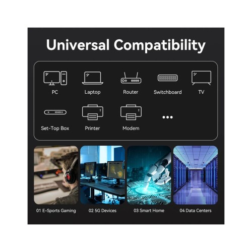 Кабель категорії cat 8 Ethernet RJ45 Network Cable 8 призначений для перемикання комп'ютерних мереж Ethernet зі стандартами 10Vase-T (10 Мбіт/с), 100WESE-T(x) (100 Мбіт/с), 1000Vase-T(x) (1 Gbits/Sec)), 10Gbase-T (10 Гбіт/с), 40GBASE-T (40 Гбіт/с/с). 40-гігабіт Ethernet (40GBE).