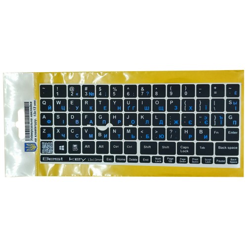 Наклейка на клавіатуру Best key універсальна 13х13мм.Наклейка на клавіатуру універсальна непрозора з синьою кирилицею.Виготовлена по спеціальній технології яка забезпечує не стирання літер. Основа матова схожа зпластиком клавіш.Підходить для клавіатур з Point Stick.В наклейках є 76 клавіші розміром 13х13 мм. які виготовлені з мякої ПВХ плівки.