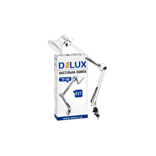 Настільна лампа Delux TF-06 забезпечує можливість вільного переміщення джерела світла над поверхнею столу, а також регулювання висоти лампи над столом, що дає оптимальний рівень освітленості для будь-яких видів робіт. Незамінний помічник на вашому робочому столі як вдома, так і в офісі. Ергономічний дизайн, сучасні матеріали та функціональність — все це об'єднано в настільних лампах Delux.