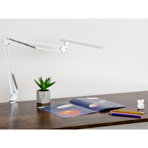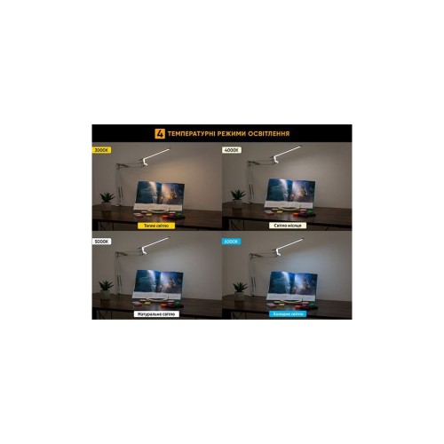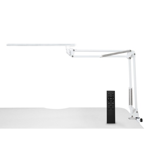 Металевий корпус та плафон легко змінюють кут нахилу, що дозволить якнайкраще організувати освітлення у робочому просторі. Металевий корпус та міцне кріплення гарантують довговічність та надійність використання на багато років. В комплект до лампи входить пульт дистанційного керування для зміни режимів освітлення, регулювання рівнів яскравості та налаштування таймера деактивації. Дальність сигналу - 15 метрів, можна регулювати навіть із сусідньої кімнати.
