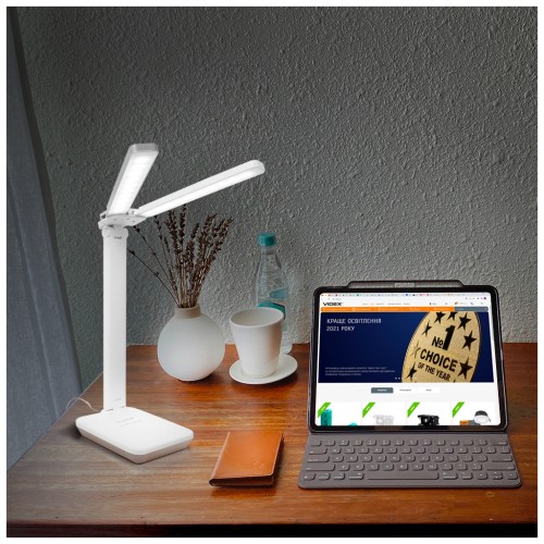 Світлодіодна настільна лампа з акумулятором TITANUM TLTF-010W - стильна та економічна з можливістю регулювання яскравості та колірності. Лампа абсолютно безшумна, компактна та має тривалий термін служби. Корпус виготовлений з екологічно безпечного високоякісного пластику білого кольору. Зовнішнє покриття корпусу імітує шкіру, що також додає лампі більший захист від подряпин. Пристосована для розміщення на робочому столі та призначена для його освітлення. Рухома конструкція лампи дозволяє скеровувати світло у потрібному напрямку. А особливістю лампи є те, що верхня частина корпусу лампи розділена на дві частини і це дозволяє ще більше підлаштовувати її під власні потреби. Реалізована можливість регулювання яскравості та зміни колірності світла, що сприяє зменшенню навантаження на органи зору в різних умовах та під час різних видів діяльності. Слугує також в якості підставки для смартфона, на корпусі для цього є спеціально відведене місце з бортиком.