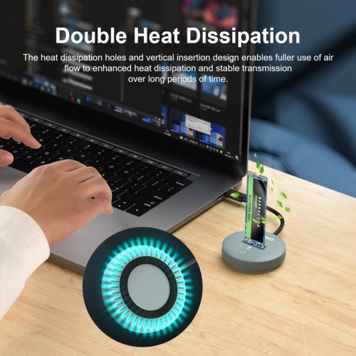 Корпус док-станції — тонкий, стильний і практичний, виконаний із пластику круглої форми. Конструкція без гвинтів дозволяє швидко вставити або вийняти SSD, а також сприяє ефективному відведенню тепла. Пристрій не потребує додаткового живлення — достатньо підключення через USB-порт.